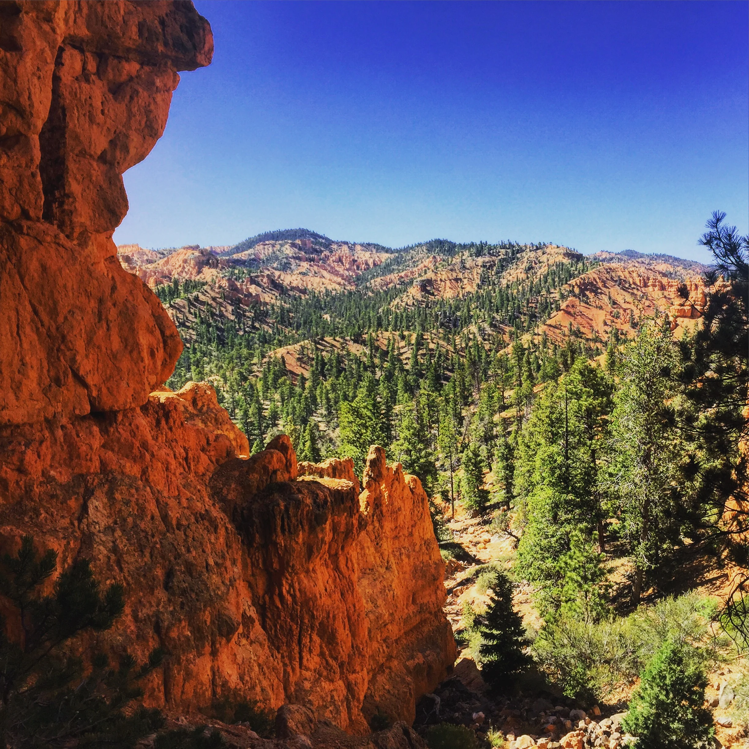 After the airport and grocery store taking longer than I expected we don’t make it the whole way to the Red Canyon as planned. We are forced to deviate from the itinerary on the first day, oh well. We find a campsite in the Dixie National Forrest that is heaven. The campsite had no water so it wasn’t full and was a discounted price also, jackpot. We walk around the campsite and get winded trying to walk uphill to the bathroom. Yikes this elevation thing is no joke. I count myself thankful I’m not pacing Doreen tomorrow. I don’t know if I would have been able to keep up in the elevation. I would have also trained more instead of slacking off after my race. At the campsite we do some yoga and stretch after sitting for so much time my body craves movement, even if I can’t walk uphill without getting winded. The first night is the coldest night we had, I wore a sweatshirt, pants, and wool socks and I was still cold.
