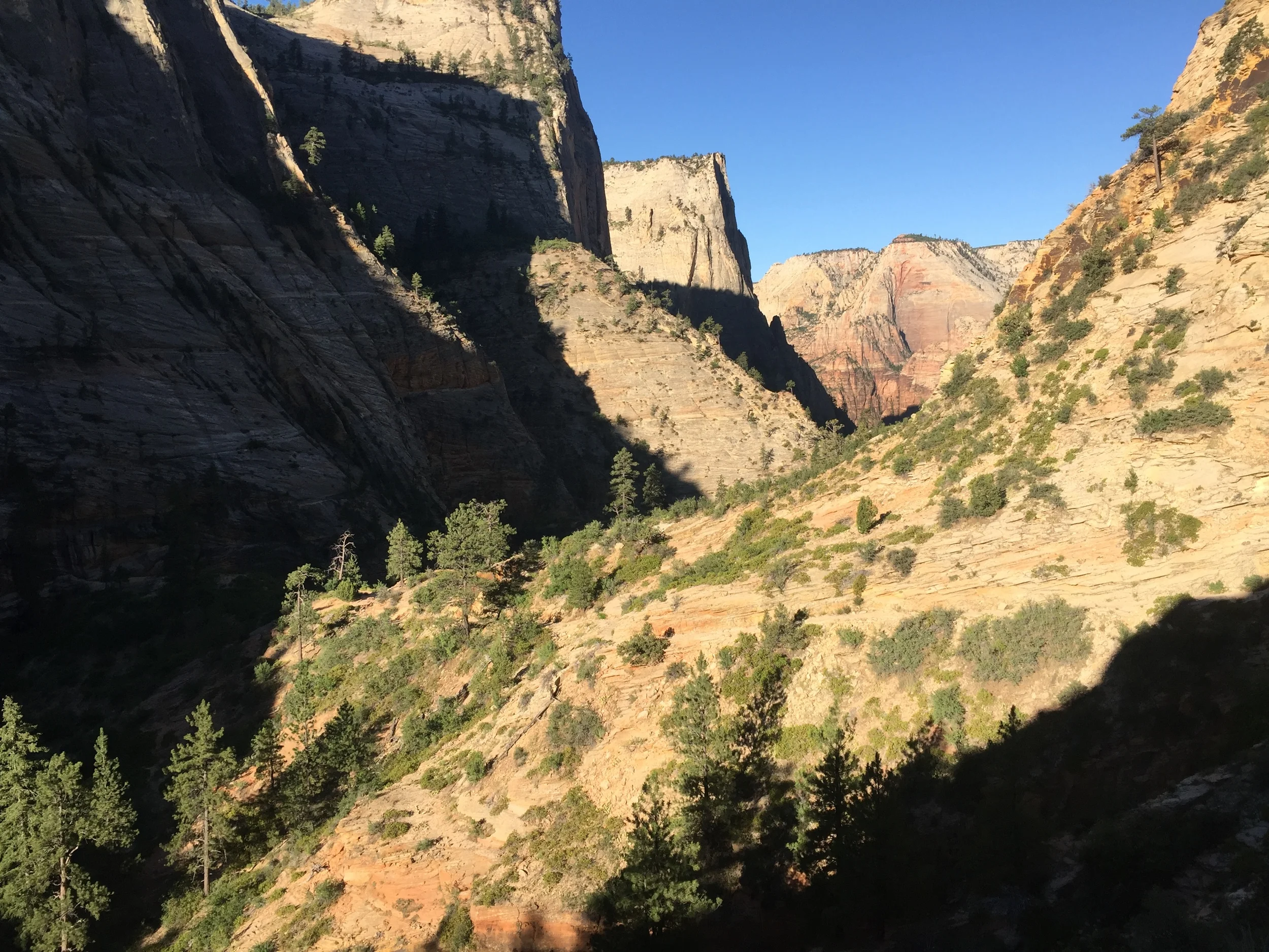 After yesterday I hoped to beat the crowds and get the first shuttle for our hike today. We didn’t make it for first shuttle but we got second. The people here in the morning are more ‘serious’ hikers. The shuttle yesterday had a bit of a city bus feel. The majority of the shuttle got off to hike Angel’s Landing but I had a recommendation from a friend to hike Observation point so that was our destination. We get off at the stop with 2 other people. Not bad as far as crowds go, after hitting up the bathroom we start our hike and pass the other 2 hikers before long. Not sure if it was the morning coffee I chugged on the way or the excitement of the first ‘real’ hike of the trip but I was off tackling the climb with ease. After relaxing at Observation Point we head back down the trail.